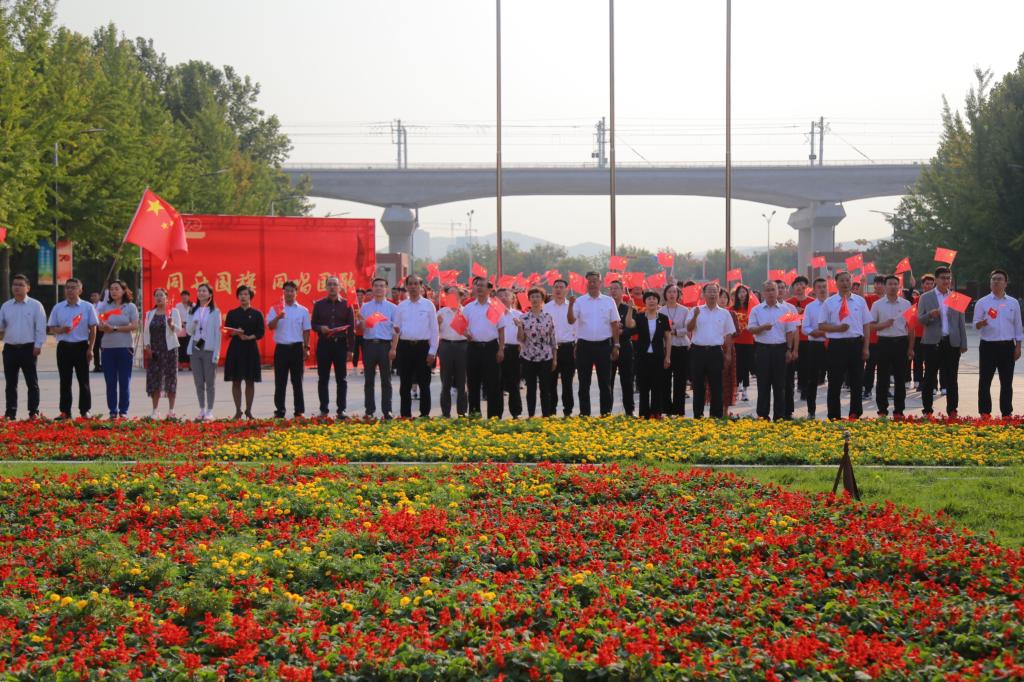 活动最后,全体人员齐唱《我和我的祖国》。在校国旗护卫队的带领下,长清校区2019级全体新生将一面巨型国旗双手托起,由学校图书馆一路向东,缓缓传递至“不忘初心 、牢记使命”主题雕塑,以此表达全校师生对祖国的爱国之情、报国之志。